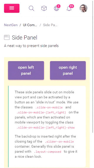 These side panels slide out on mobile view port and can be activated by a button as an "slide in/out" mode. We use the classes .slide-on-mobile and .slide-on-mobile-{left,right} on the panels, which are then activated on mobile viewport by toggling the class .slide-on-mobile-{left,right}-show